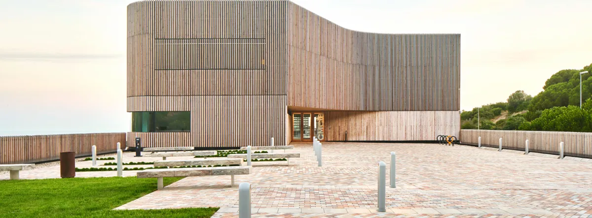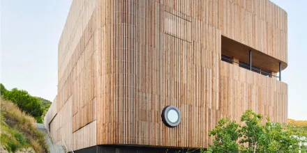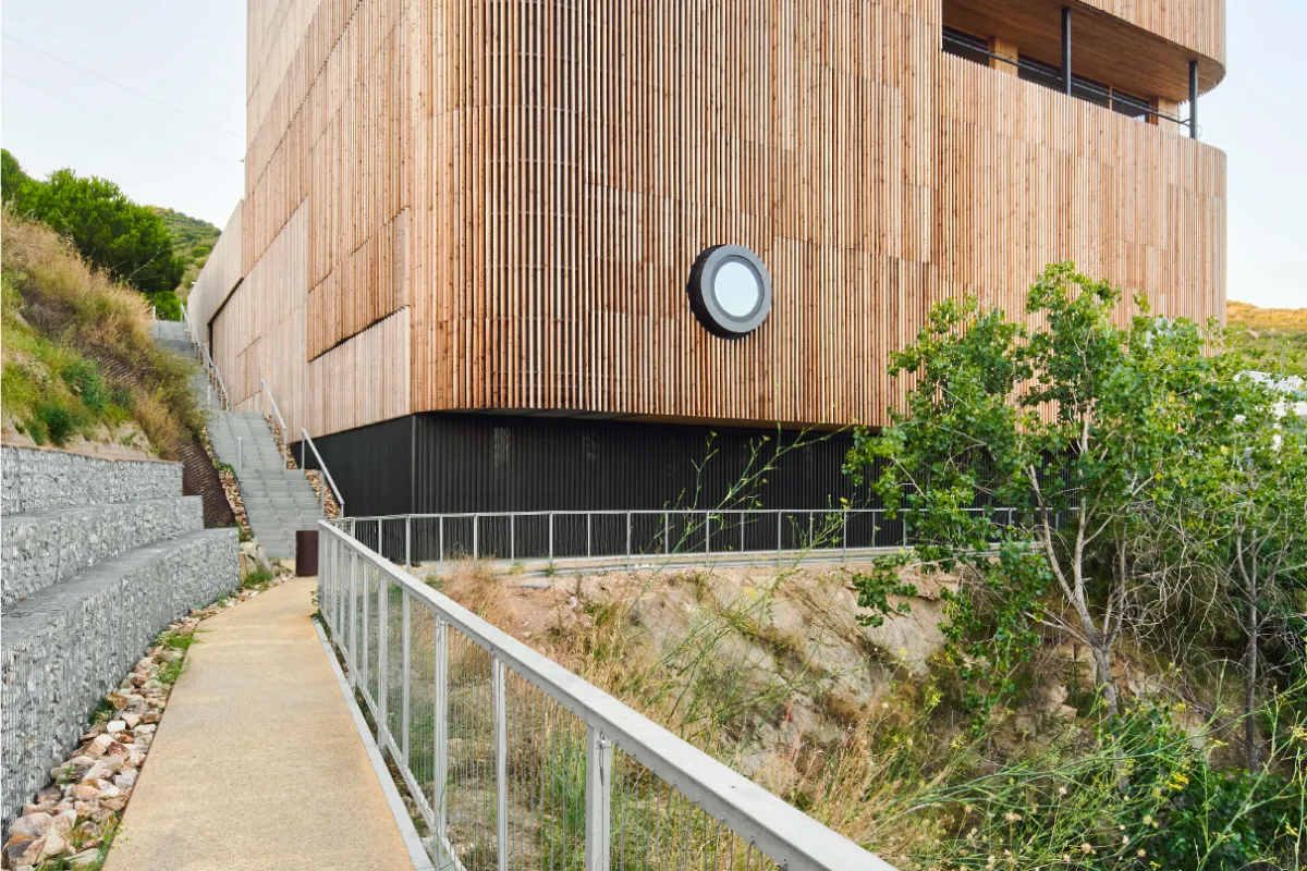 La integración con el entorno se aborda desde la implantación del volumen en la topografía, la definición de una geometría orgánica y su materialidad, así como la naturalización de los espacios exteriores. El edificio se encuentra en una parcela de gran desnivel que limita con la zona forestal en el punto más alto del campus universitario. Se aprovecha esa diferencia de cota para generar un edificio topográfico que relaciona los distintos niveles, articulando el programa en su interior y generando el mínimo volumen aparente. Así, las plantas de investigación, que requieren condiciones climáticas estables, permanecen semienterradas, ocultas y resguardadas bajo una superficie de cubiertas vegetadas ligadas al lugar. El volumen aparente, compacto y de aristas redondeadas, busca la relación con el entorno a través de una concavidad curvilínea que abraza la plaza de acceso y de una envolvente biosférica de madera que participa del entorno natural del Parc de la Serralada de Marina.