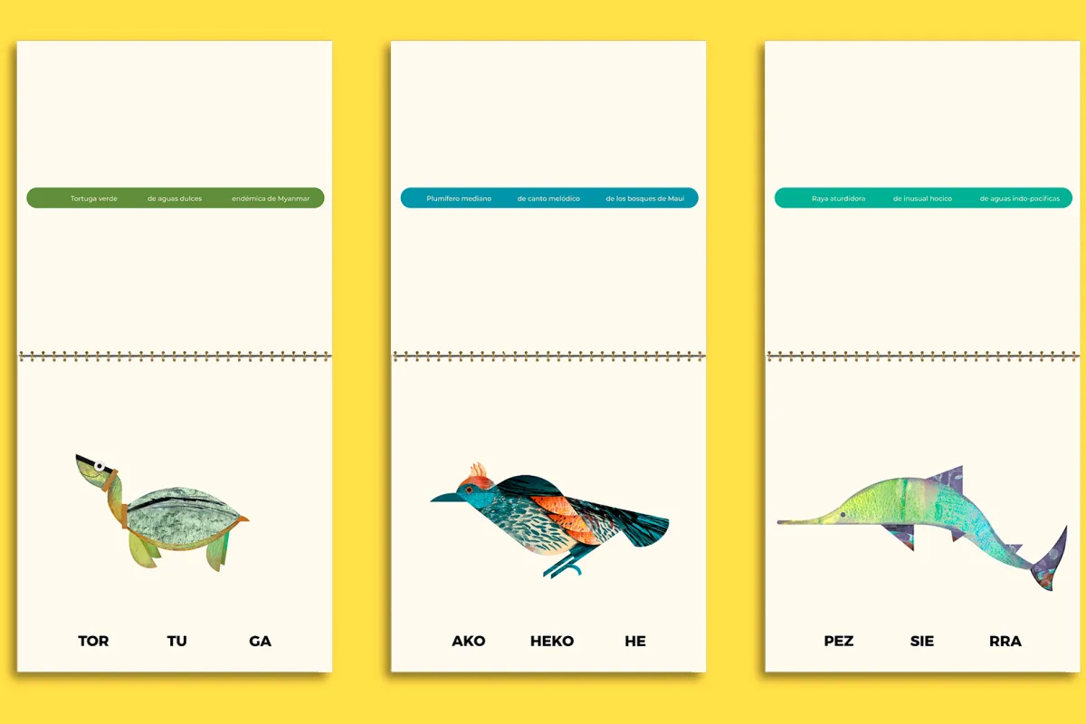 La obra fusiona técnicas analógicas y digitales, integrando estructuras vectoriales con texturas manuales en 20 ilustraciones únicas. Cada criatura se acompaña de descripciones detalladas sobre las razones de su peligro de extinción, uniendo geometría y color para dar voz a las especies más vulnerables. El resultado es un animalario interactivo que redefine el diseño editorial como un motor de cambio social y ambiental.