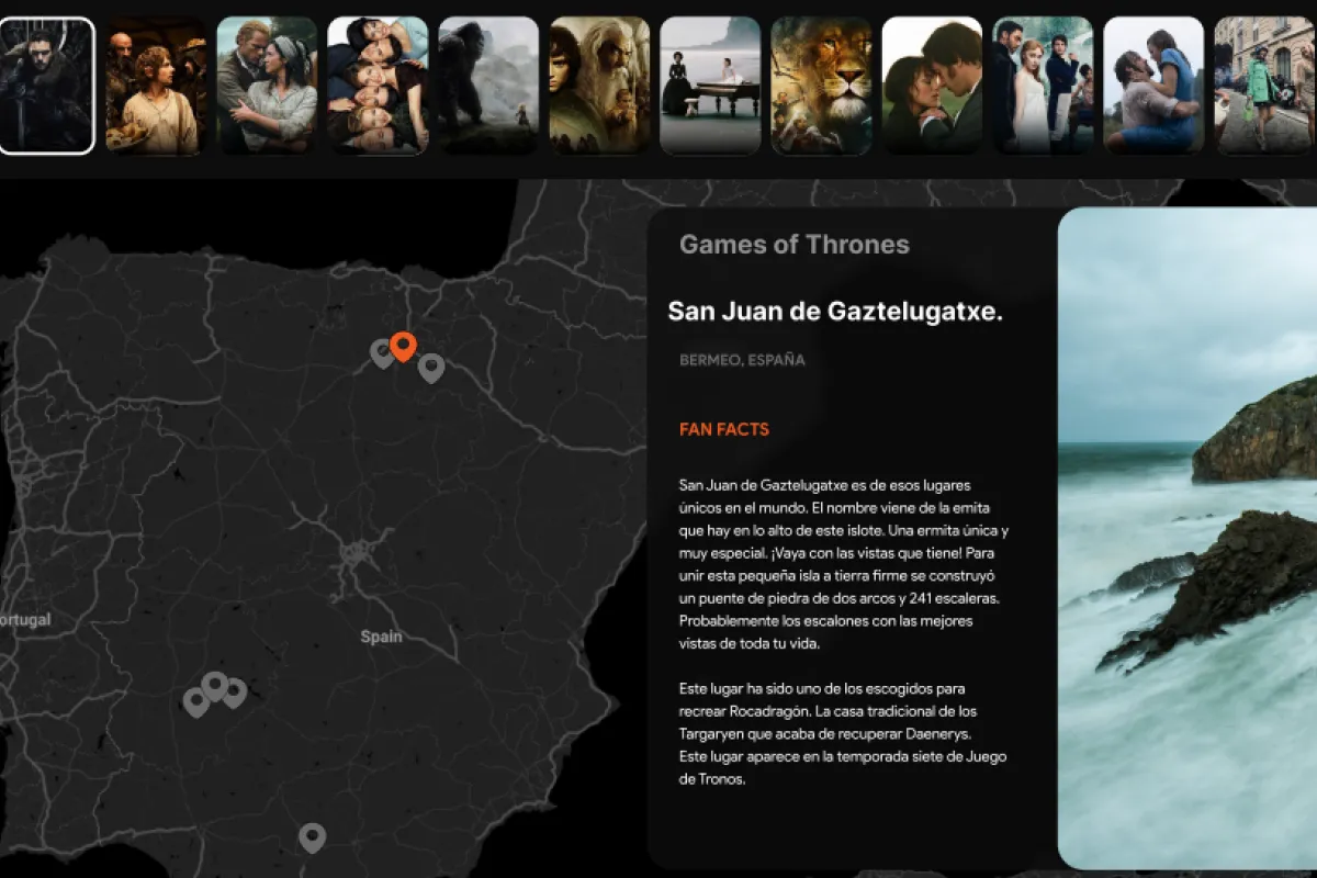 El proyecto desarrolla un ecosistema multidispositivo formado por app móvil y web, con mapas interactivos, filtros por película o serie, creación de itinerarios y funcionalidades sociales. Una experiencia UX/UI cuidada convierte la planificación del viaje en un proceso intuitivo, visual y emocional.