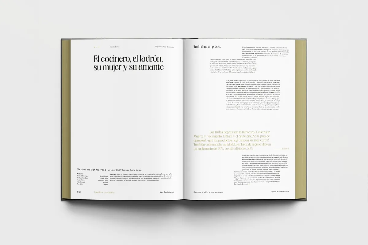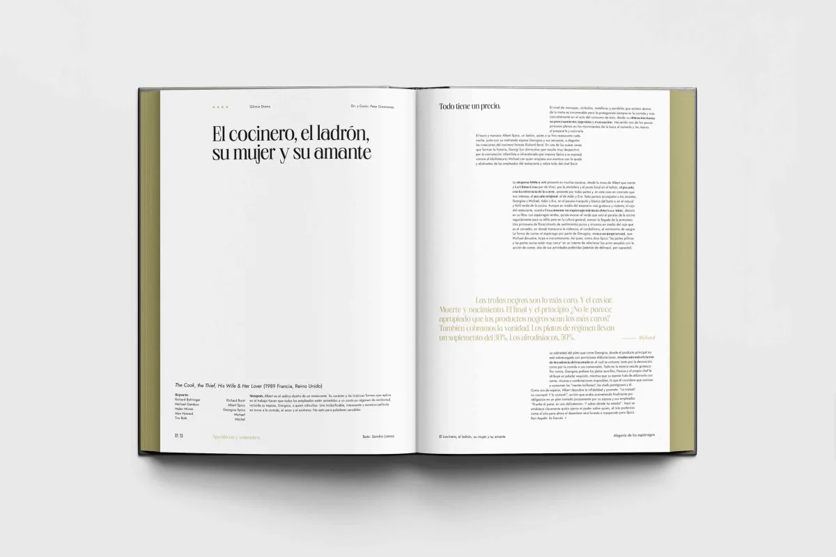 El libro incluye artículos de opinión y análisis sobre las películas, ficha técnica, recetas relacionadas e ilustraciones que completan y enriquecen las historias con la gastronomía. En su versión digital, se convierte en un buscador de recetas, con fragmentos en vídeo, ficha técnica y actores, películas o platos relacionados.