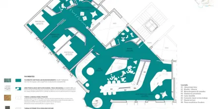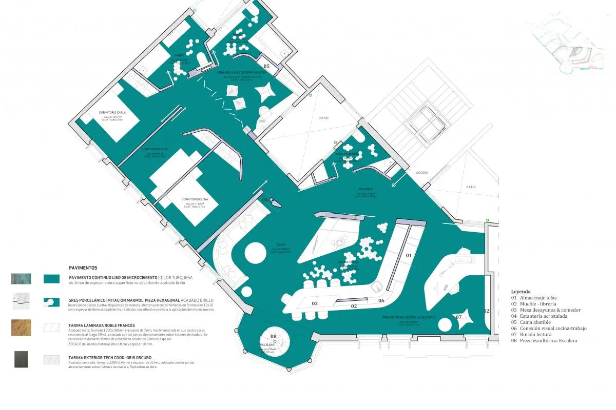 Este recorrido se transforma en una membrana móvil, dinámica, que permite la mutación del lugar como en los bosques, donde el resplandor se abre paso a través del follaje y donde sus hojas son representadas en la pared como elementos hexagonales, repetitivos en el suelo de la cocina y baños, conforme se desprenden en el otoño. La escalera simboliza el camino que lidera al estío, el renacer; representada como una pieza escultórica que conduce al emplazamiento exterior de la vivienda.