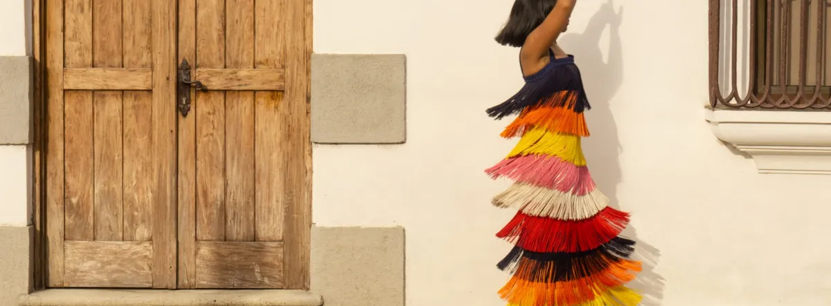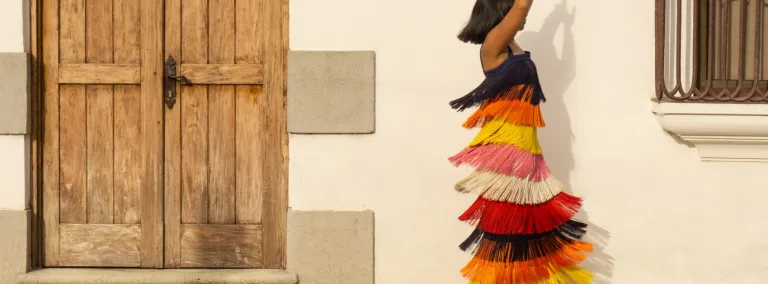 Es un trabajo que profundiza en la cultura de Guatemala a través de la moda, en el cual se unen técnicas artesanales como el bordado a través de estampados coloridos.