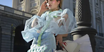 Esta es la espiral de autodestrucción en la que estamos inmersos y sobre la que gira esta colección de moda. Siguiendo con la línea del exceso, y desarrollando más la idea, para que se pueda presentar de una forma atractiva en una colección, he recurrido al rococó del siglo XVIII y, más en concreto, en la corte francesa y su célebre y ostentosa reina María Antonieta.