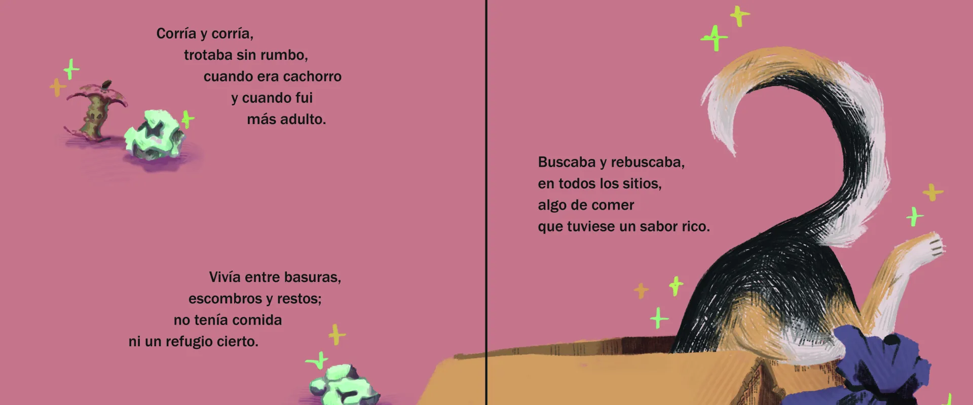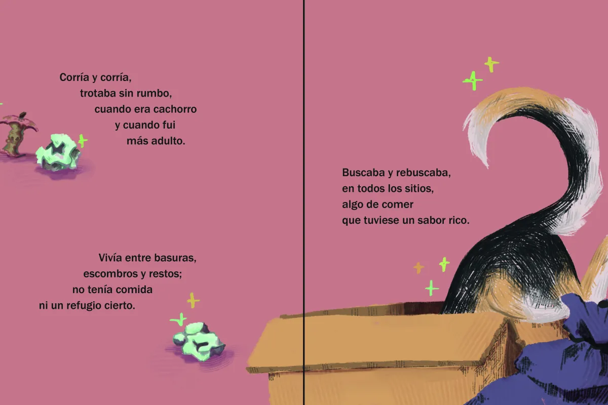 La historia sigue a Dustin, un perro callejero que atraviesa experiencias de rechazo, miedo y supervivencia hasta encontrar un hogar. El estilo visual, de inspiración tradicional y trazo expresivo, junto a una paleta cromática cuidada, refuerza la carga emocional del relato y acompaña el ritmo narrativo del texto.