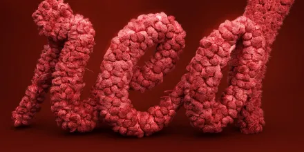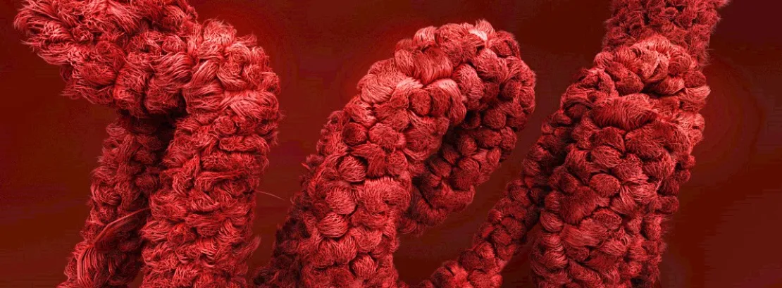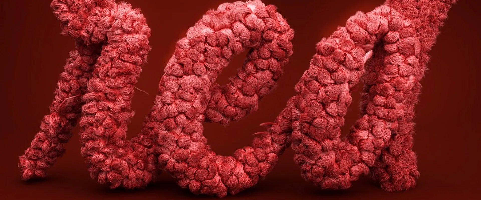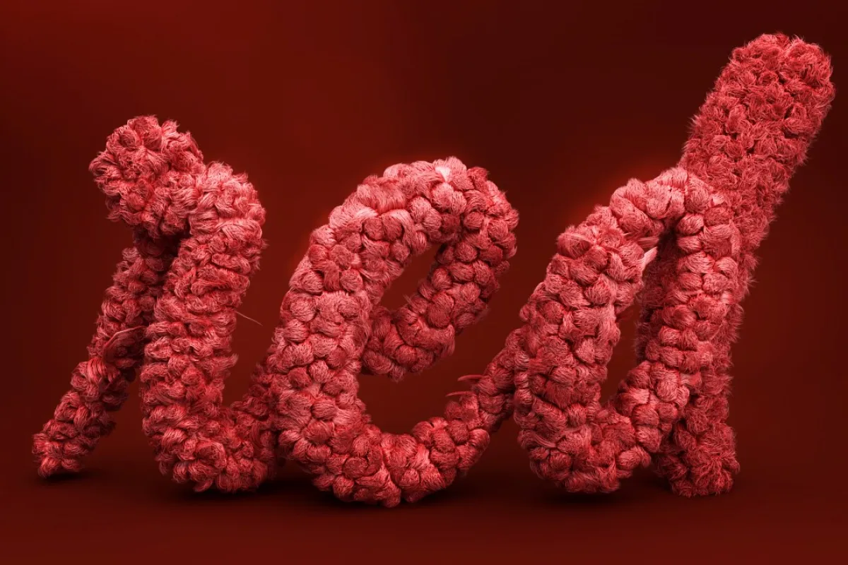 Busca expresar propiedades visuales que se puedan asociar con el color rojo, a través de un material textil, similar a la lana que se viera como algún tipo de figura orgánica siendo un texto. Para conseguir este resultado se realizaron pruebas hasta llegar a la caligrafía de base en Adobe Illustrator. El objetivo era que estuviese conectada o que así lo simulara, porque en realidad las 3 letras que lo componen están separadas, y la perspectiva de la cámara es la que logra que parezca una misma estructura que se envuelve.