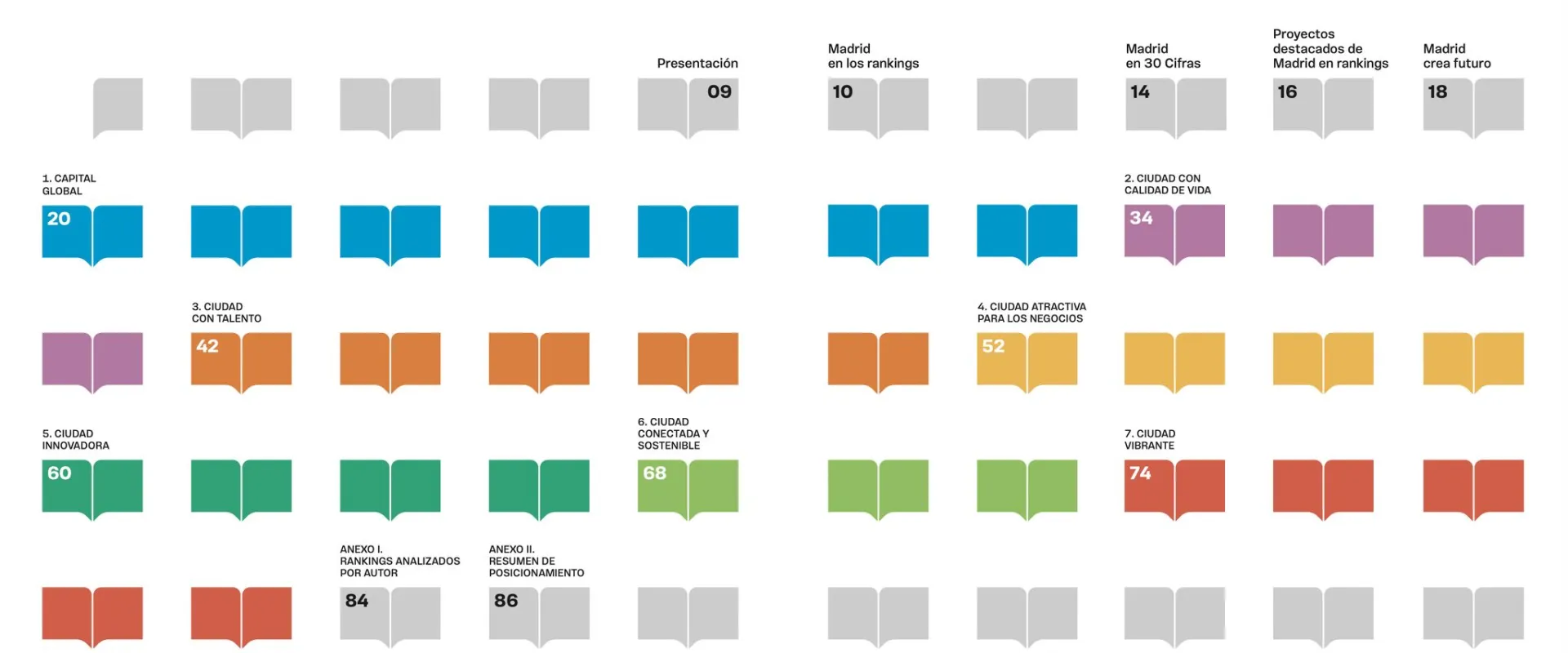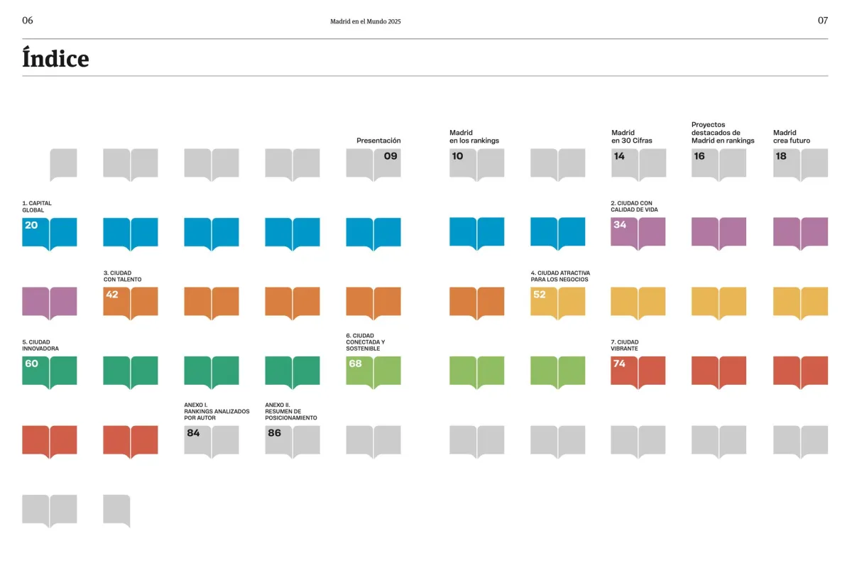 El trabajo de Faura pone en valor el diseño como herramienta estratégica para comunicar información institucional de forma rigurosa y, al mismo tiempo, cercana. La publicación no solo recopila cifras, sino que construye un relato visual coherente sobre el posicionamiento internacional de Madrid.